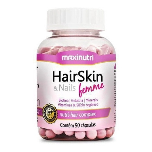 O HairSkin & Nails Femme da Maxinutri age no fortalecimento e na manutenção da saúde do cabelo, pele e unhas, apresenta em sua fórmula nutrientes que estão cientificamente relacionados a manutenção e integridade de cabelos e unhas quebradiças, restaurando seu crescimento, equilíbrio e beleza. Além de repor nutrientes importantes para nossa saúde, o auxilia no combate aos radicais livres, que causam o envelhecimento da pele, melhorando não apenas a saúde e prevenindo doenças. Não contém glúten e lactose.